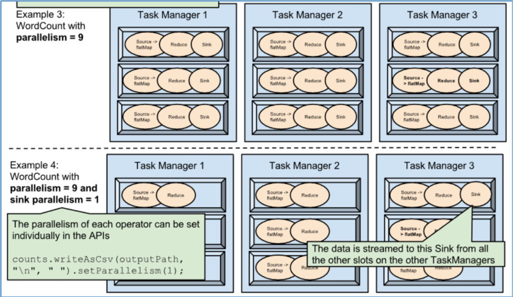 如果提交的Flink 任务所有算子并行度为9,就算其中有一些操作并行度为1(如example4中sink操作)同样占用Flink集群9个taskslot。