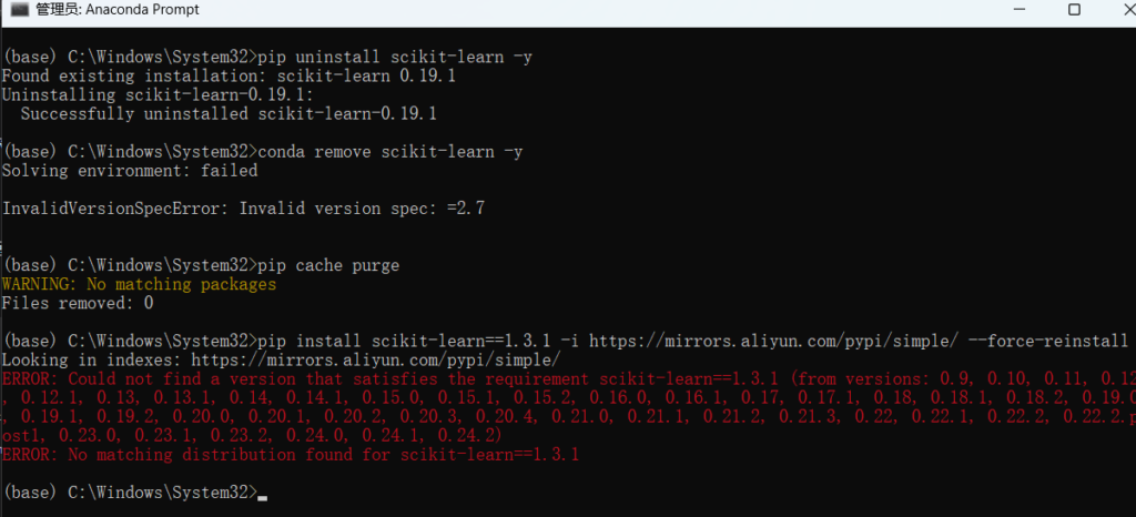 在annaconda中执行重装sklearn相关命令时,显示python版本过旧!