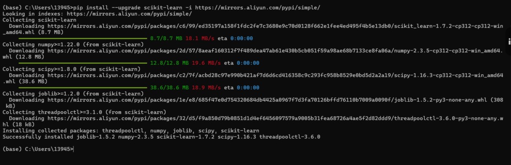 pip install –upgrade scikit-learn -i https://mirrors.aliyun.com/pypi/simple/ 通过阿里云镜像源安装,速度很快